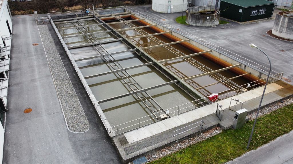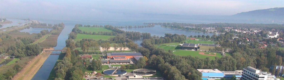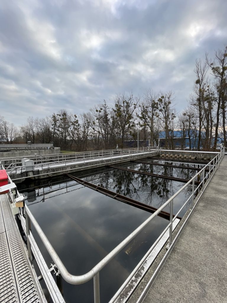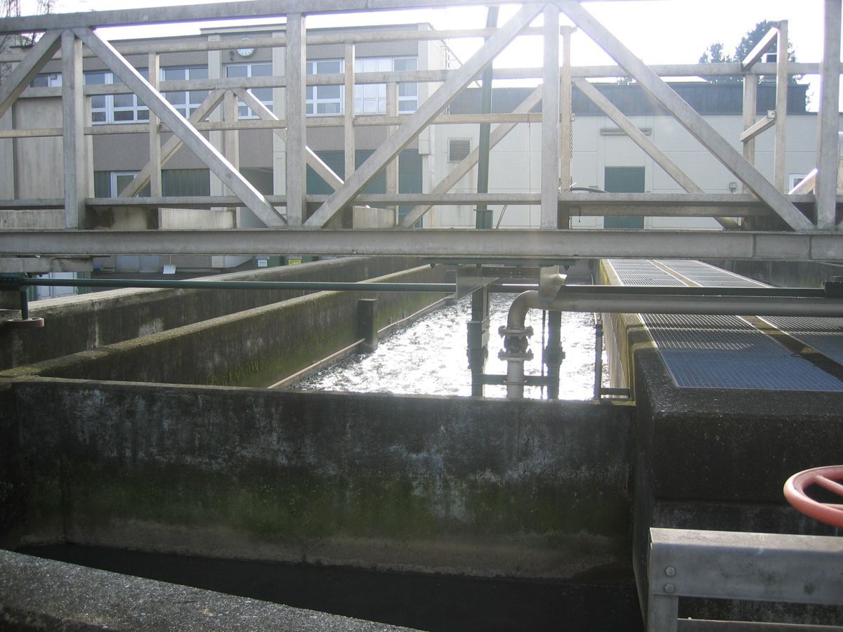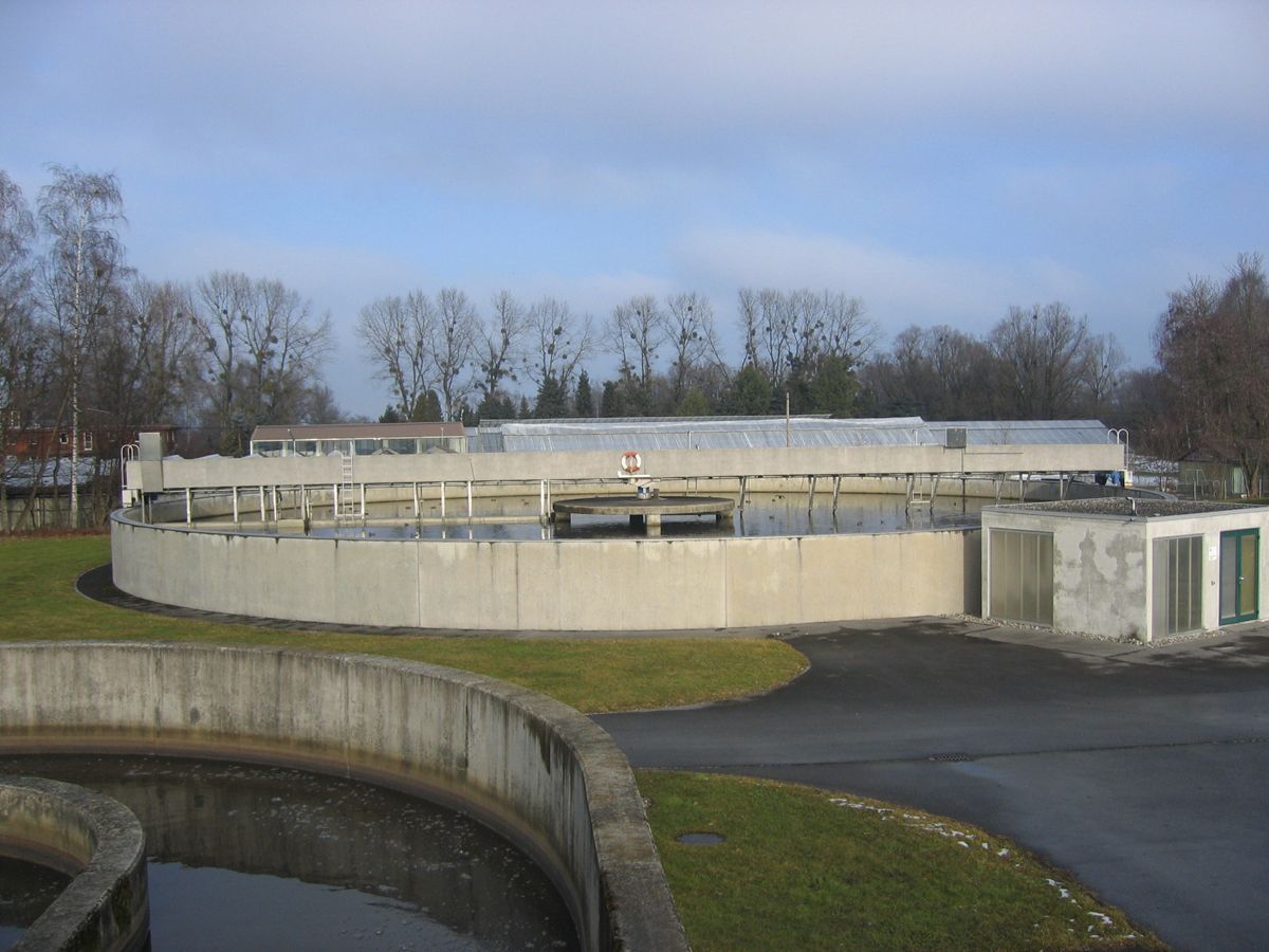 Für die Nachklärung stehen vier Becken mit insgesamt 14.000m³ Fassungsvermögen bereit. Hier wird das gereinigte Abwasser von der Bakterienmasse getrennt und in den Vorfluter (Dornbirner Ache) eingeleitet. Das Abwasser ist zwar zu einem hohen Grad gereinigt kann aber nicht als