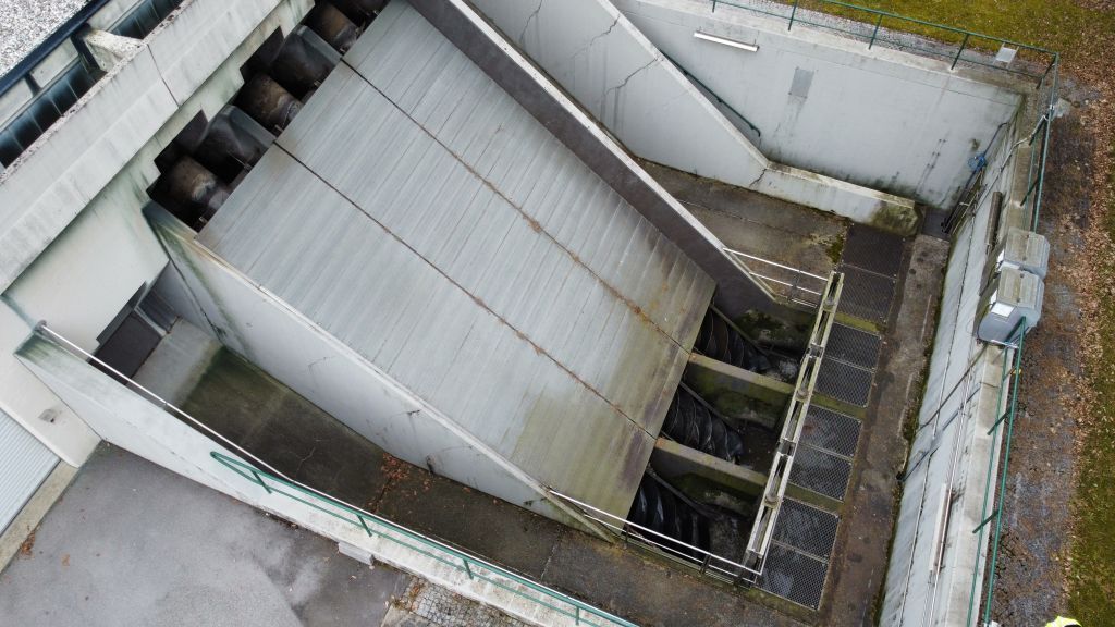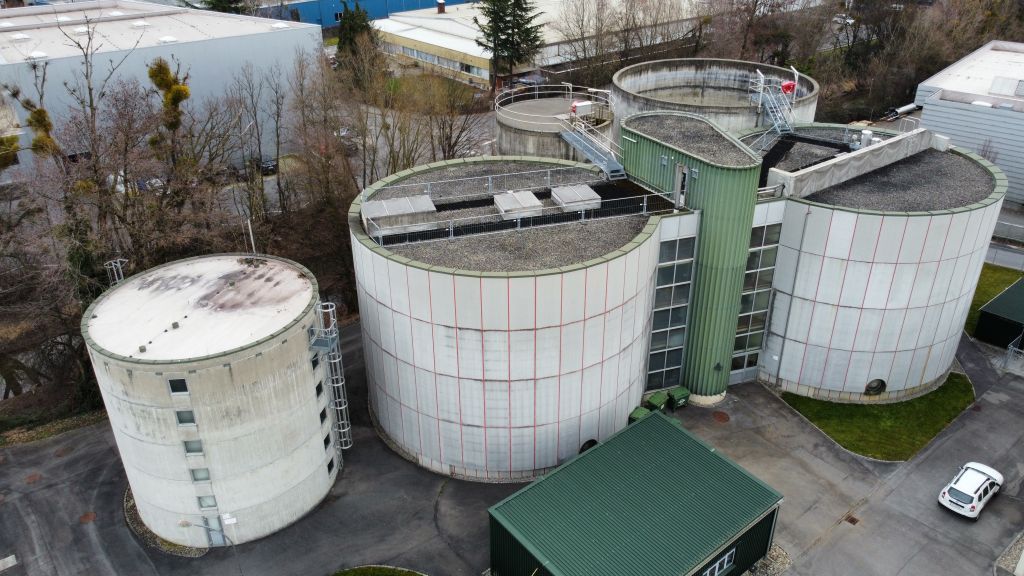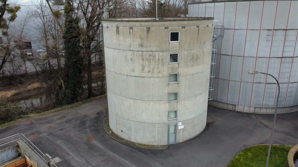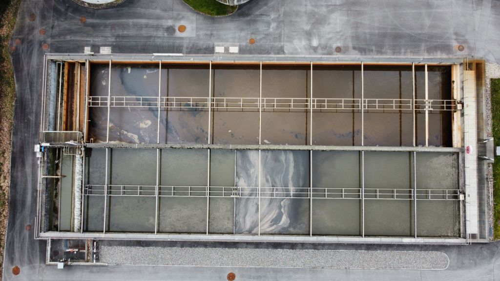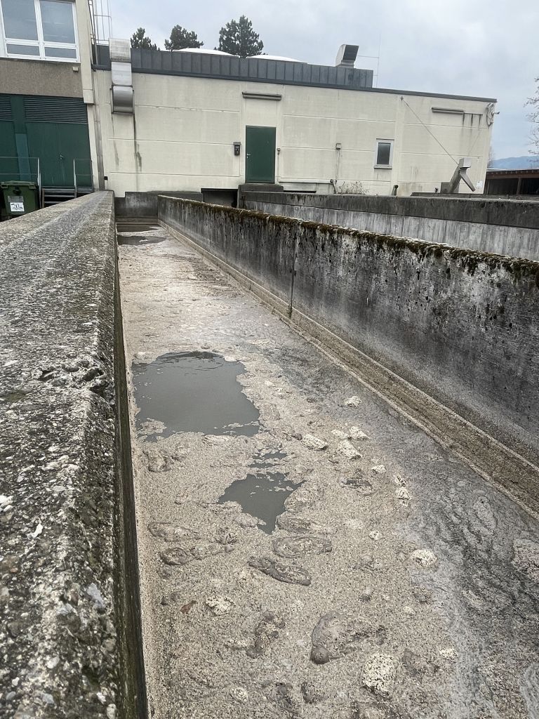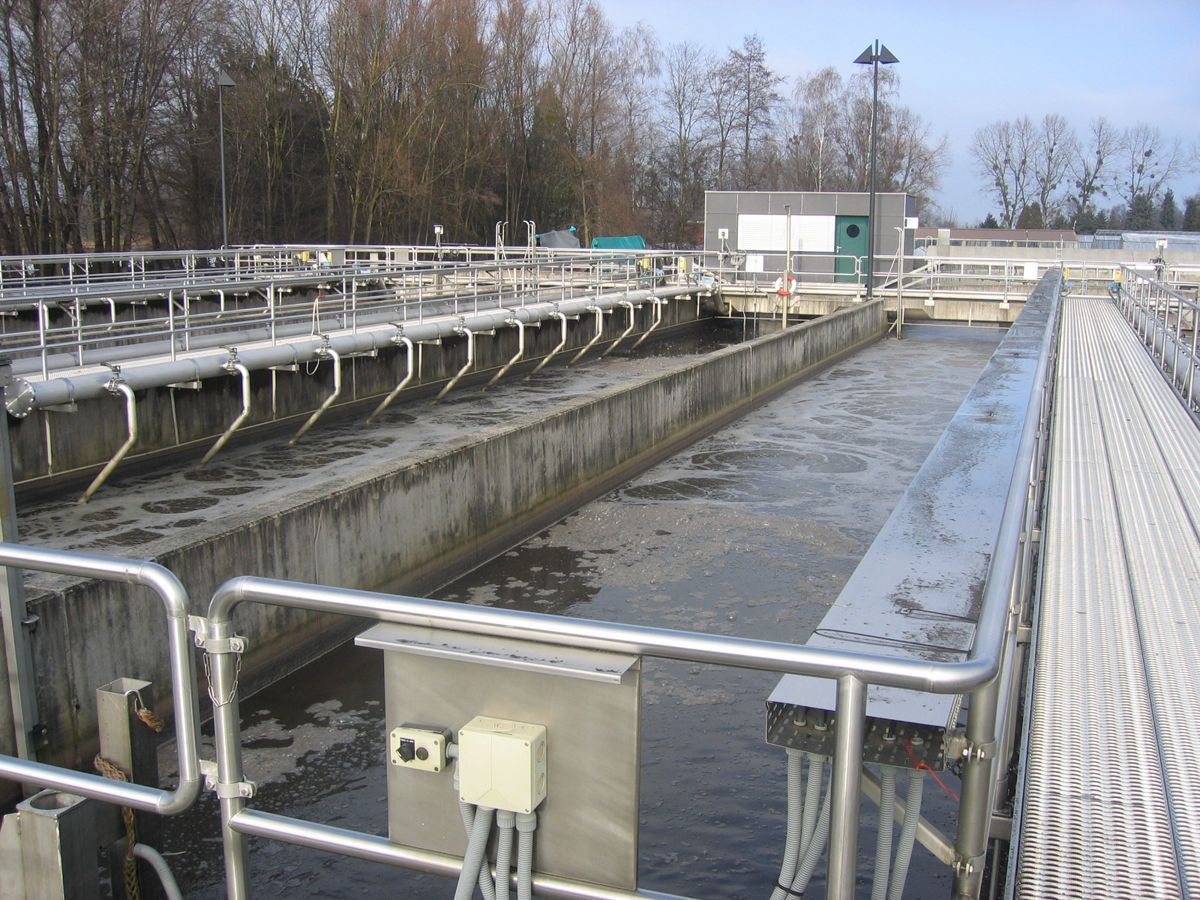 Für die Nachklärung stehen vier Becken mit insgesamt 14.000m³ Fassungsvermögen bereit. Hier wird das gereinigte Abwasser von der Bakterienmasse getrennt und in den Vorfluter (Dornbirner Ache) eingeleitet. Das Abwasser ist zwar zu einem hohen Grad gereinigt kann aber nicht als