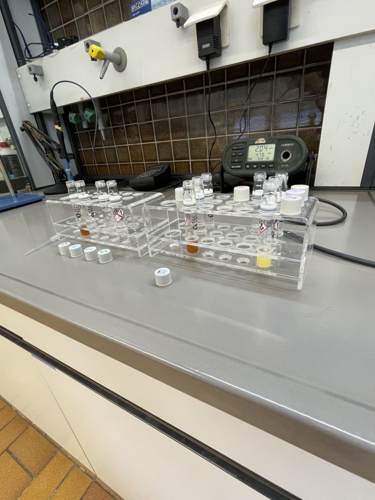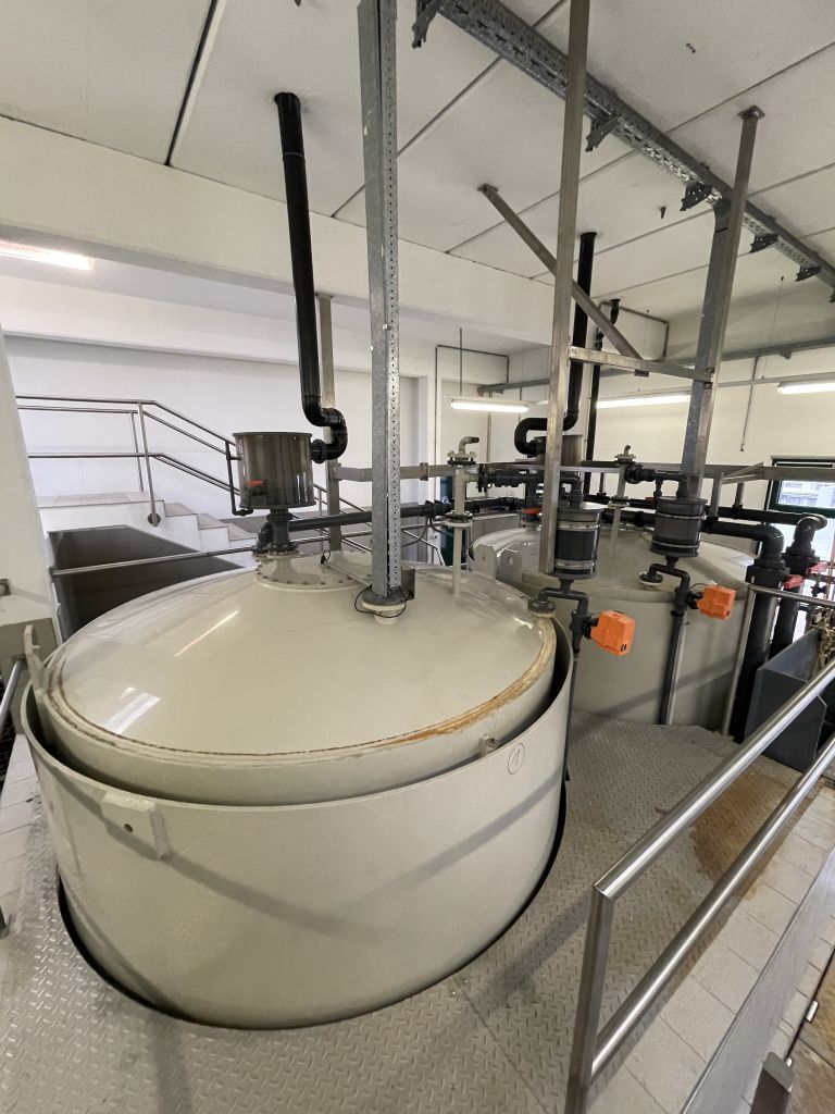 Dadurch begründet das der Phosphor (starker Dünger) bei uns biologisch nur zum Teil abgebaut werden kann (zu kalt), muss auf die chemische P- Fällung zurückgegriffen werden. Mittels Dosierpumpen wird Eisen (II)- Sulfat (ungiftig!) in das Abwasser eingebracht und so der Phosphor an die Bakterienmasse gebunden und in weiterer Folge der Schlammbehandlung zugeführt. Zur Lagerung des Eisensalzes werden zwei Tanks mit je 20m³ verwendet.